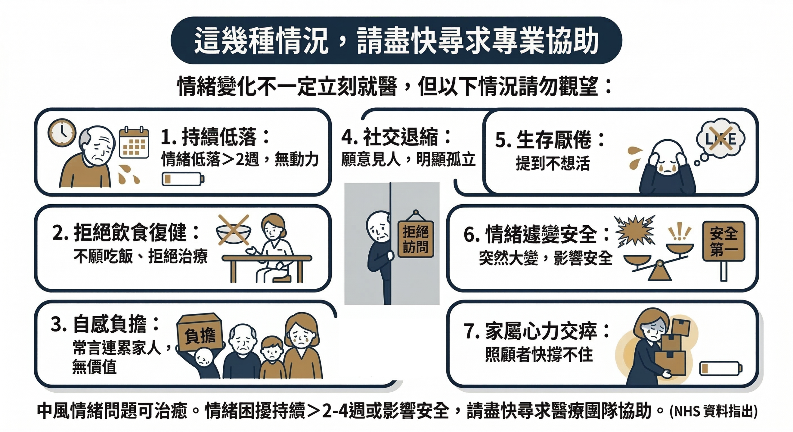 ⚠️ 中風後的情緒問題是可以評估、也可以處理的。 英國 NHS 的資料指出,若情緒困擾持續超過兩到四週,或已影響到安全,應盡快尋求專業協助。