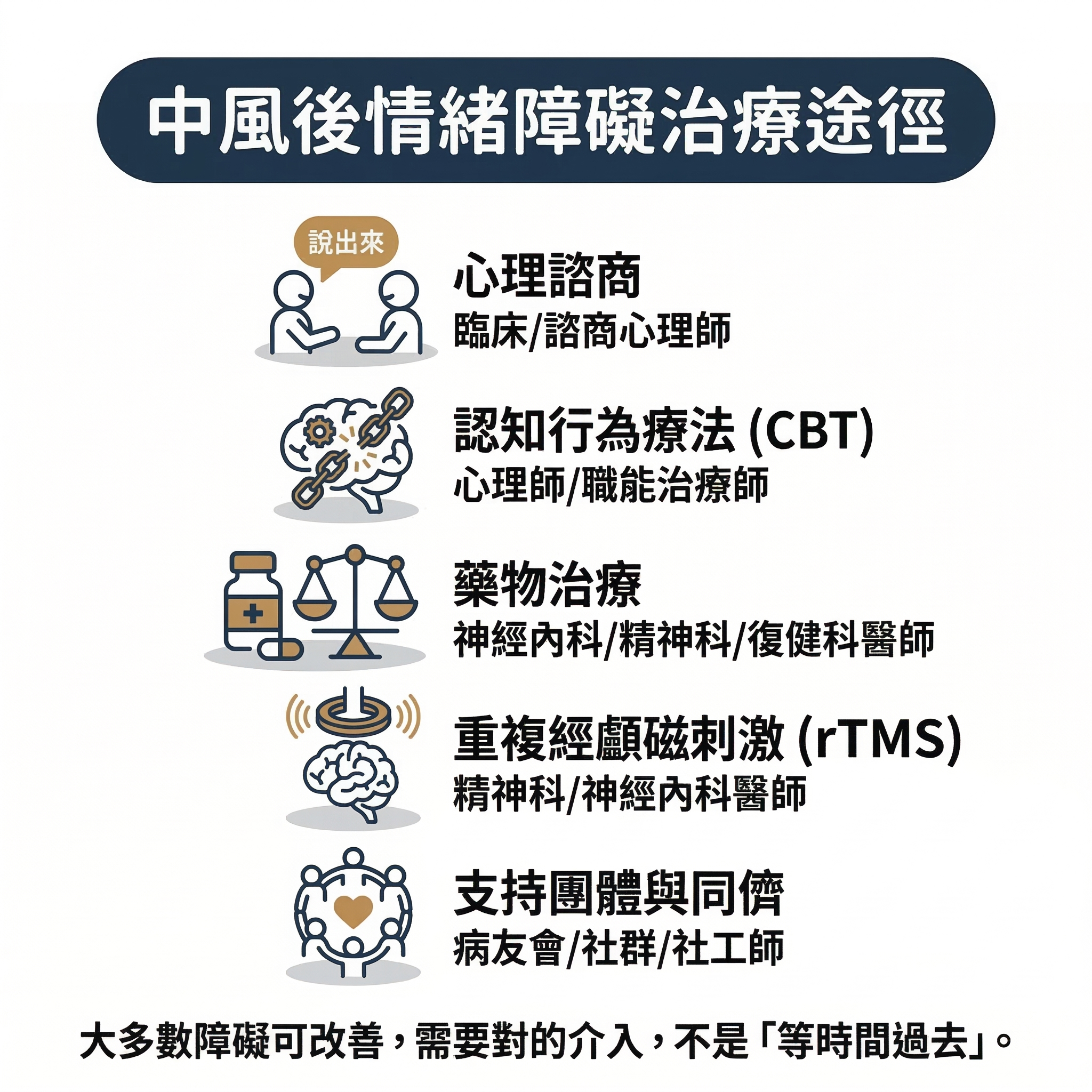 👉 可以提供協助的專業:神經內科醫師、精神科醫師、復健科醫師。如果不確定要掛哪科,可以從目前的復健科或神經內科醫師開始,說明情緒狀況,請他們評估或轉介。