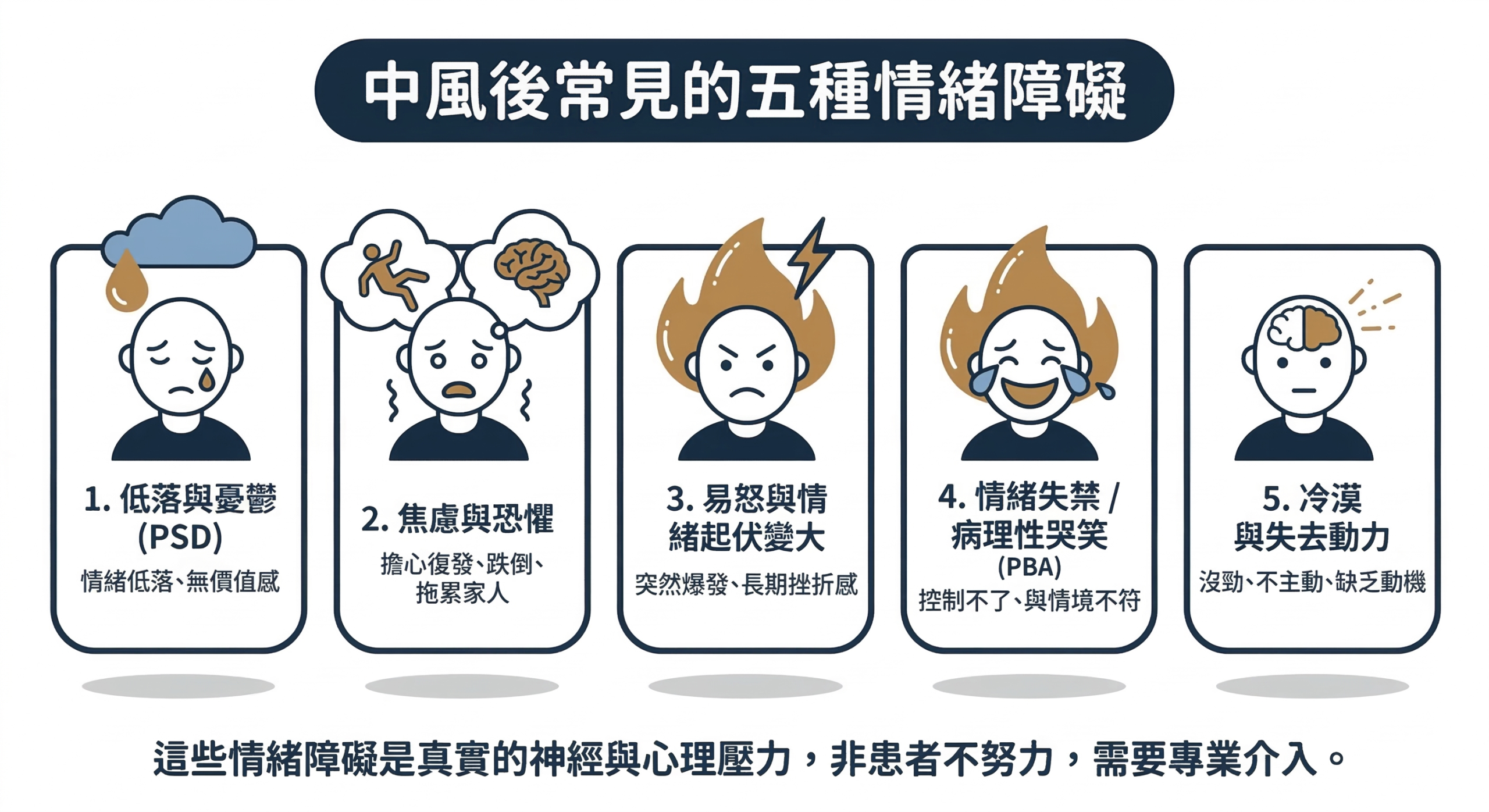 💬 中風後出現憂鬱、焦慮、易怒、冷漠、情緒失禁,不是患者「想太多」或「故意難搞」,這些情緒障礙影響約三分之一的中風患者,成因包括腦部神經損傷、生活巨變與慢性疲勞。