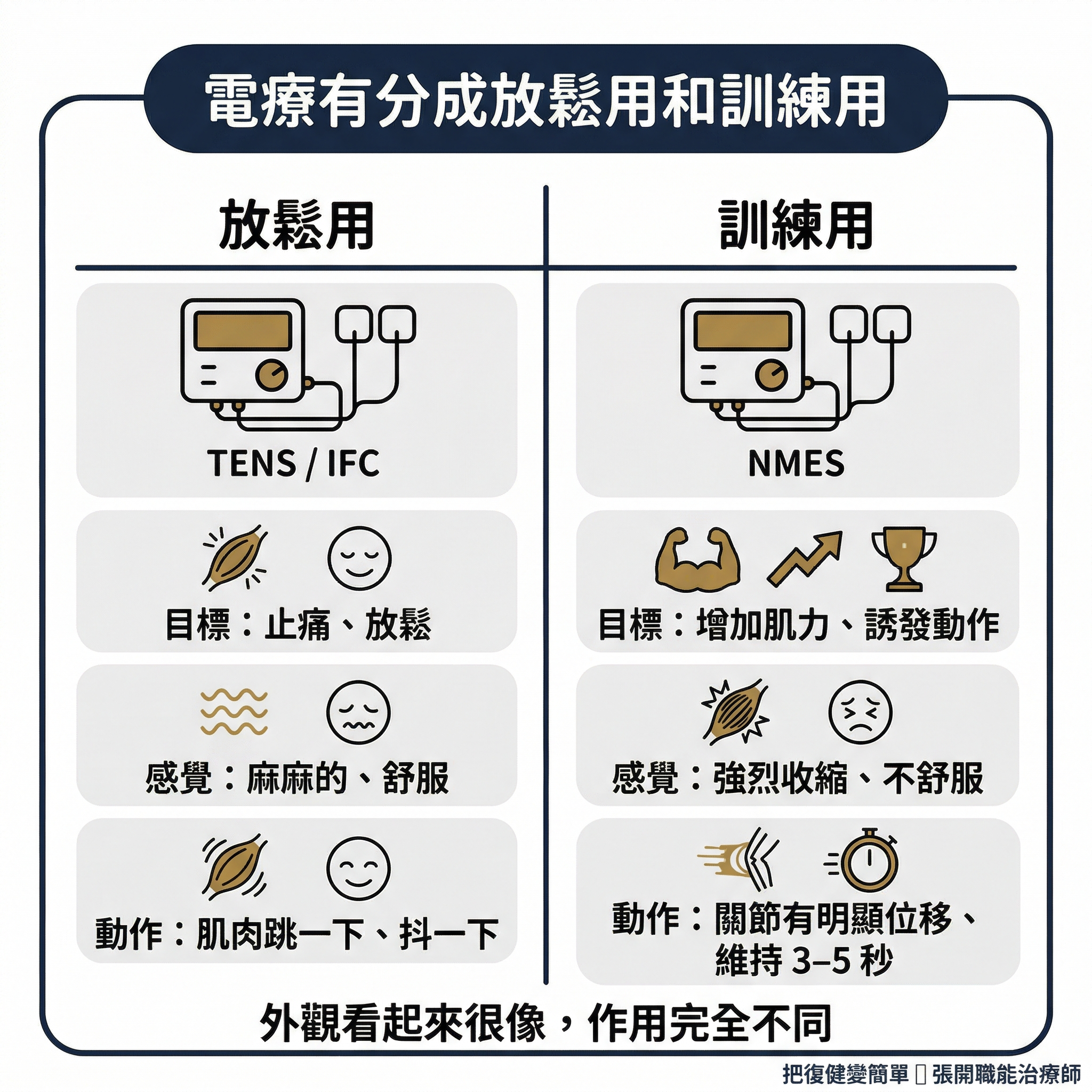 - 電療分兩種,一種用來止痛和放鬆,一種用來訓練動作和增強肌力,用錯就沒效。