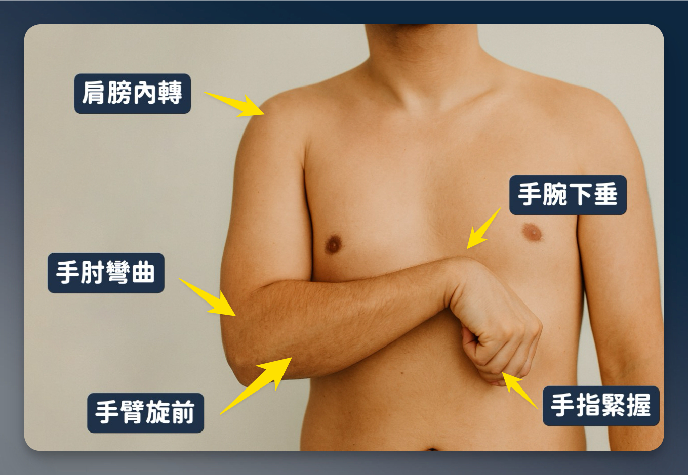 你會看到肩膀內縮、手肘整個彎起來,前臂旋前,手腕和手指都縮在一起,想要伸直或打開都很困難。
