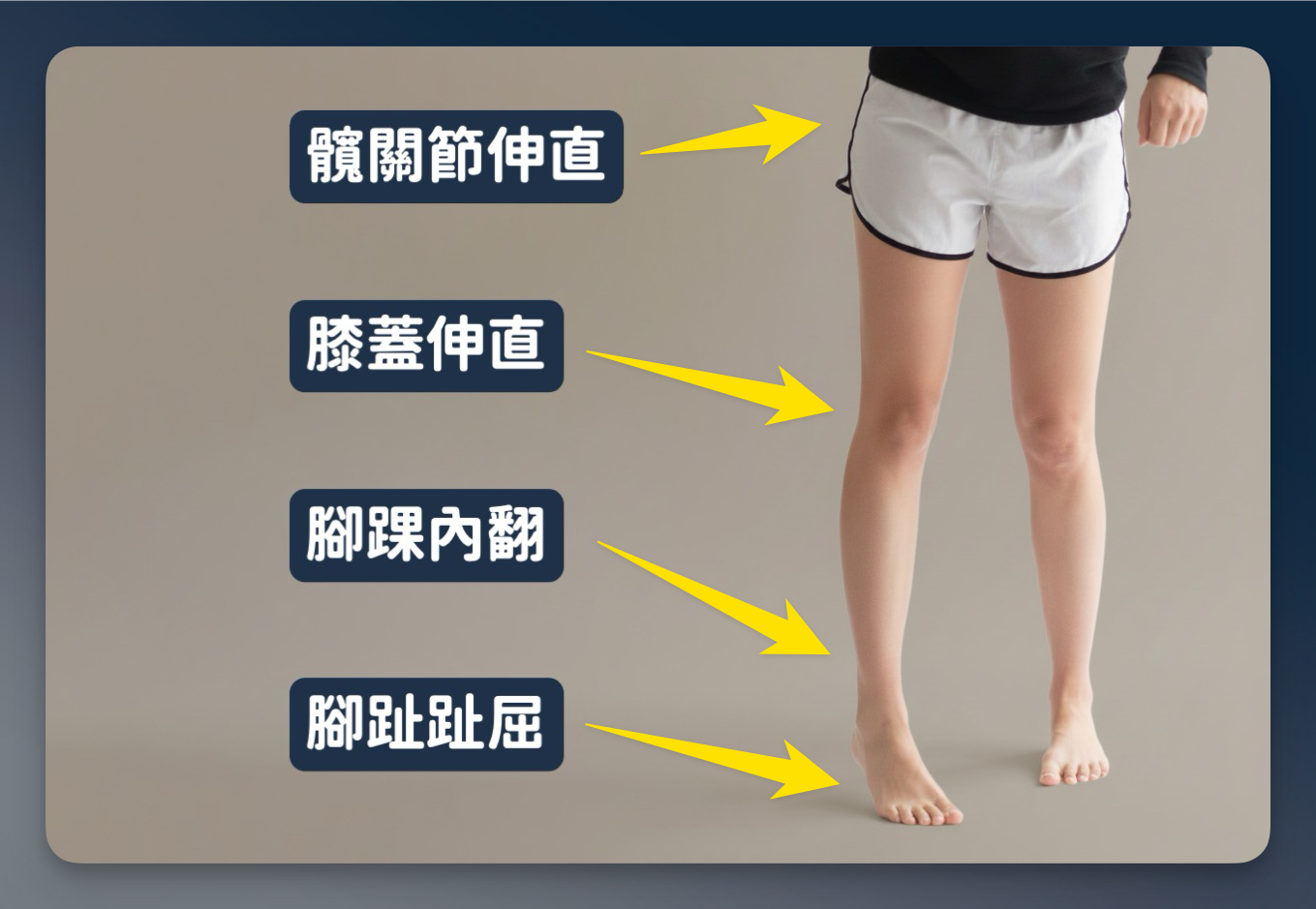 你會看到髖關節伸直、膝蓋整個打直、腳踝下壓,有時還伴隨著足內翻和腳趾抓地。