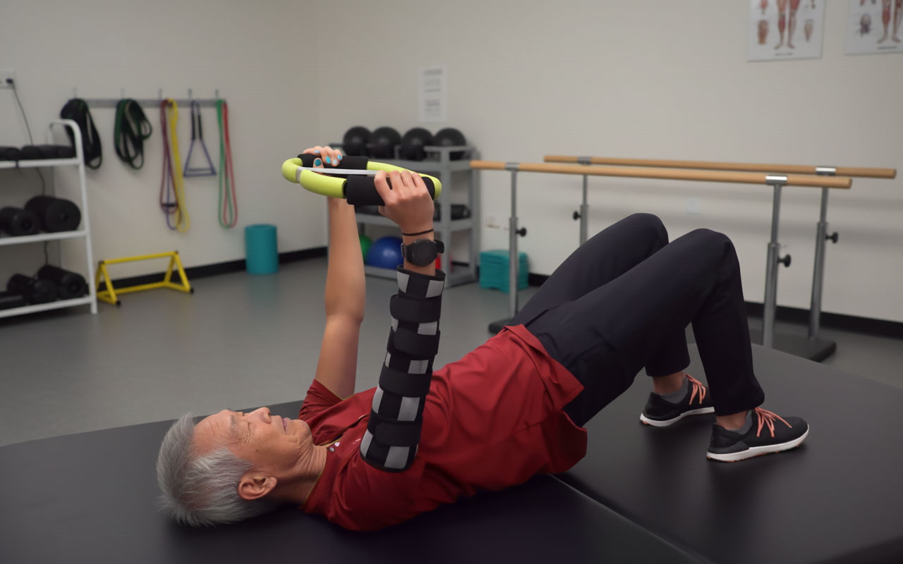 這時可以用固定護具(gaiter)把手肘固定住,讓你專心練肩膀的抬高、外展或前舉,避免手肘一直亂跑。