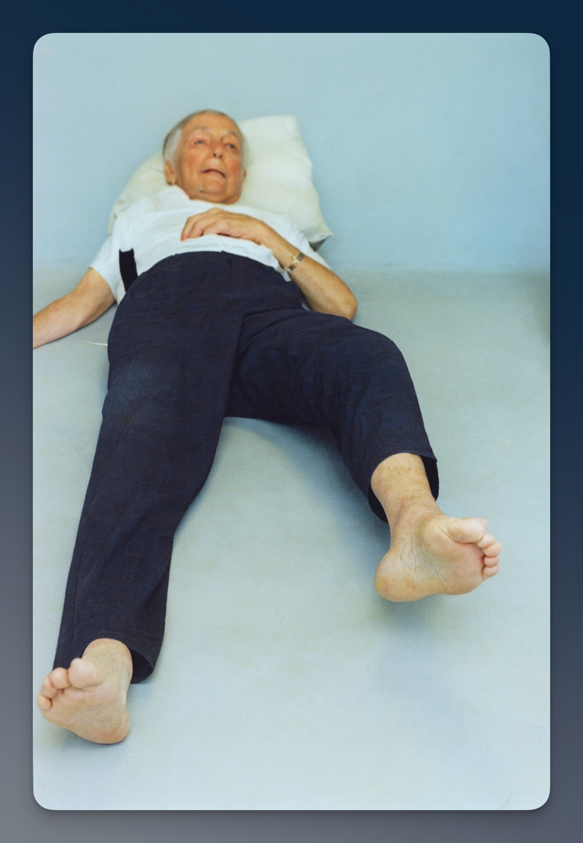 - 想走幾步,腿卻僵得像木棍,腳背下垂,常常踢到地板,跨不過門檻;